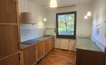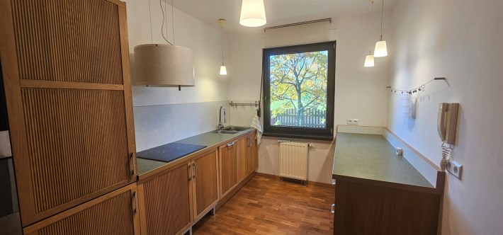 Kuchnia z zabudową meblową i sprzętem agd. Do kuchni przynależy niewielka spiżarnia, która jednocześnie pełni funkcję kotłowni.