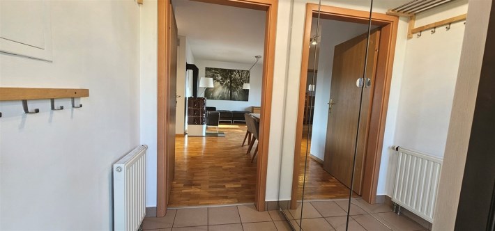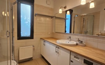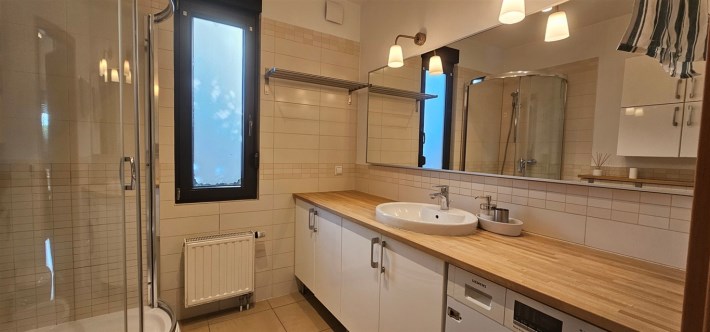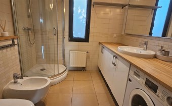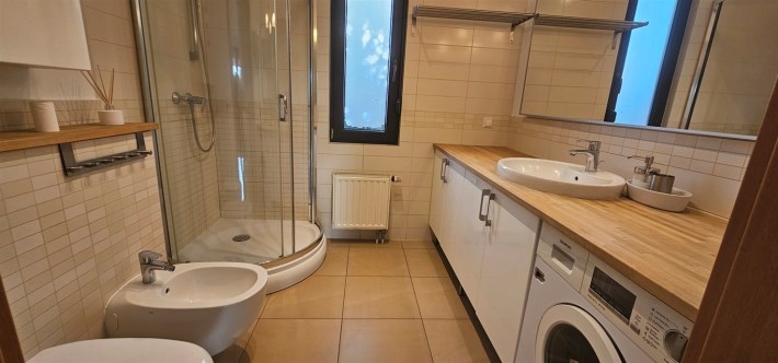 W łazience prysznic, wc, bidet, umywalka, pralko suszarka. Podgrzewana podłoga.